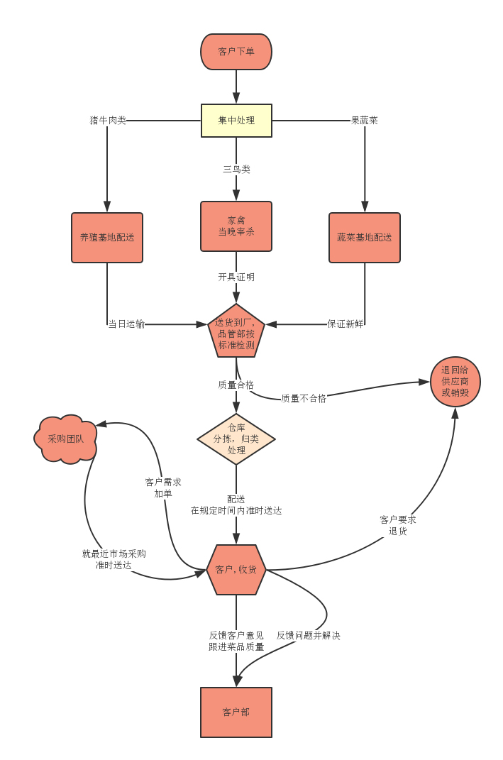 簽訂合同→確認(rèn)價(jià)格→下訂單→組織貨源→分揀稱量→按照客戶要求處理產(chǎn)品→配送→驗(yàn)收→服務(wù)反饋→結(jié)算